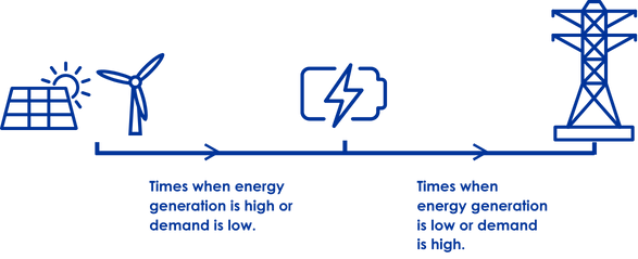 In simple terms, a Battery Energy Storage System facilitates the storage and release of energy. It serves as a buffer, storing energy either from renewable sources like solar and wind, or directly from the main grid. The stored energy can later be discharged back into the grid during periods when demand is high or when there's limited energy generation (e.g. when it’s dark or there’s no wind).